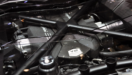 Động cơ của Aventador LP700-4 không nằm ở giữa xe. Đó là điều khá lạ lùng ở siêu xe này. Các kỹ sư của Lamborghini đã đặt động cơ lệch sang bên trái một chút để cân bằng trọng lượng của xe tới các bánh xe.