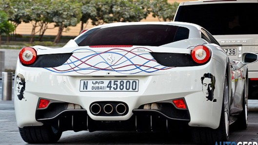 Trên thân xe Ferrari 458 Italia màu trắng này in hình các danh thủ nổi tiếng của Barcelona, bên cạnh đó, hai bên cản sau ở đuôi xe còn in hình của hai cầu thủ nổi tiếng nhất là Xavi và Messi.