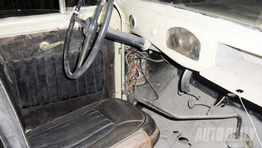 Buồng lái chiếc Juvaquatre, chiếc xe đã bị tàn phá nặng nề bởi thời gian, thậm chí cửa xe cònkhông thể đóng được mà phải buộc sợi dây vào vô lăng