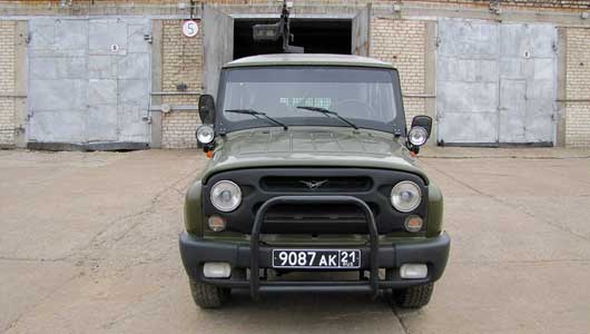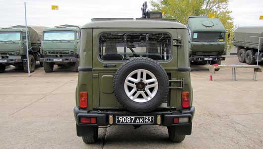 Đầu xe có một chút thay đổi so với UAZ-469, cụm đèn vẫn tương tự, ở trước kính chiếu hậu có thêm 2 đèn