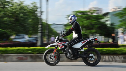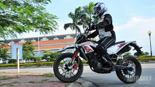 Ở trên những đoạn đường bằng phẳng của phố thị, với cặp lốp không gai, xe lướt khá êm ở dải tốc độ từ 60 đến 70 km/h, nhưng lại tỏ ra hơi đuối ở tốc độ cao hơn. Với một chiếc xe kiểu cào cào sở hữu động cơ 125cc, chúng ta cũng không kì vọng gì nhiều ở tốc độ của nó. Tuy nhiên, chiếc xe lại chứng minh khả năng vượt địa hình của mình khi người điều khiển thử leo lên những vỉa hè cao, thậm chí là dải phân cách đường. Hành trình của phuộc nhún dài, động cơ khỏe ở cấp số 2 hoặc 3 khiến TR 125 SM vượt qua chướng ngại vật dễ như trở bàn tay.