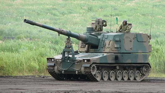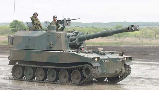 Xe pháo tự hành Mitsubishi Type 99 cỡ nòng 155mm. Cùng với Type 75, đây là bộ đôi pháo tự hành duy nhất của pháo binh Nhật Bản.