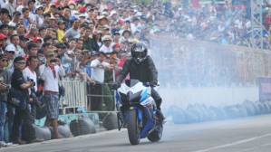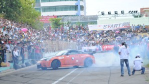 Màn drift của xe máy kết hợp với ôtô của các vận động viên biểu diễn thuộc nhóm D1 Workshop Việt Nam ngay sau đó còn ấn tượng hơn. Những pha drift quay tròn, bám cua với tốc độ cao làm khán giả phải thót tim.
