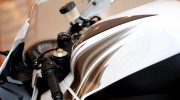 Đèn pha được thiết kế tách rời với ốp xếch hai bên khiến chiếc xe trông thật mạnh mẽ phối cùng với phần đầu xe vuốt nhọn như mỏ chim ưng đã phần nào làm cho “bộ mặt” của xe trông ngầu hơn. Kính chắn gió được gắn trên đỉnh của phần vỏ ốp đầu, vồng lên ở giữa vừa là điểm núp gió lý tưởng vừa mang tính khí động học có tác dụng ghìm đầu xe xuống mặt đường khi người cầm lái “lướt gió” ở tốc độ cao.