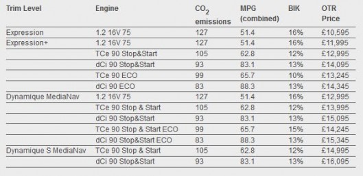 Cuối cùng là bản 1,2 lít 4 xy-lanh TCe 120, công suất 88 kW (120 mã lực), mô-men xoắn 190 Nm. Tuy nhiên, động cơ này sẽ có mặt vào nửa đầu năm 2013.