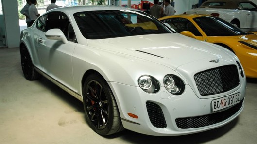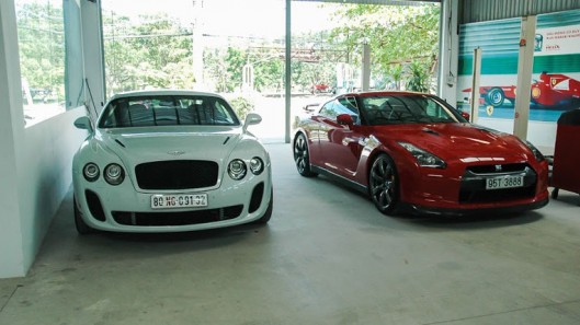 Bentley Continental SuperSports trắng đứng cạnh Nissan GT-R đỏ.