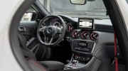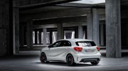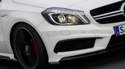 Cản sau kết hợp với một cặp ống xả mạ crom hình chữ nhật và đầu xe được trang bị lưới tản nhiệt hai lá đặc trưng cho dòng xe này. Lô-gô “TURBO AMG” gắn lên cả hai chắn bùn phía trước hoàn thiện vẻ ngoài mạnh mẽ cho chiếc xe. Nội thất nổi bật với trang trí sợi các-bon trên bảng điều khiển, ghế bọc da đen cùng đường chỉ khâu màu đỏ. Phiên bản này cũng được trang bị vô lăng ba chấu đa chức năng tiêu chuẩn và một cụm điều khiển đặc trưng của AMG có thể tích hợp với bộ đếm thời gian.A45 AMG sở hữu động cơ 4 xy lanh mạnh nhất thế giới hiện nay