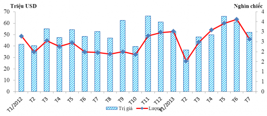 Lượng và trị giá nhập khẩu ô tô nguyên chiếc các loại từ tháng 1-2012 đến tháng 7-2013.