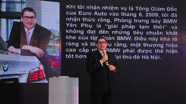 Hình ảnh trên là khoảnh khắc của TGĐ BMW Euro, ông Auto Horst J.Herdtle phát biểu trong lễ khai trương trung tâm BMW 4S Long Biên vào cuối tháng 6/2013. Với tổng diện tích gần 6.000 m2 và vốn đầu tư trên 100 tỷ đồng, BMW 4S Long Biên tại số 1 Ngô Gia Tự, Long Biên, Hà Nội sẽ là trung tâm tích hợp đầy đủ dịch vụ gồm kinh doanh (Sales), dịch vụ (Services), phụ tùng (Spare Parts) và hệ thống (System) và là một trong những trung tâm xe hơi và xưởng dịch vụ quy mô nhất tại Việt Nam với 20 khu vực sửa chữa xe.