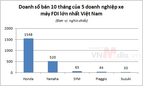 Theo thống kê sơ bộ của Hiệp hội các nhà sản xuất xe máy Việt Nam (VAMM), trong 10 tháng đầu năm 2014, doanh số bán của 5 doanh nghiệp xe máy FDI lớn nhất là Honda, Yamaha, SYM, Piaggio và Suzuki đạt hơn 2,2 triệu chiếc, giảm 3,4% so với cùng kỳ năm ngoái.