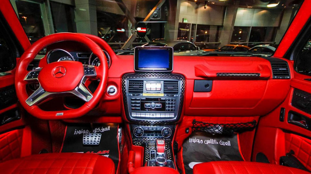 Có lẽ thay đổi nhiều nhất của xe chính là nằm ở bên trong khung sắt đồ sộ. Gần như hoàn toàn nội thất bên trong xe đều có một màu đỏ rực rỡ kết hợp với các chi tiết làm từ sợi cacbon, thường thấy trên những gói độ của Brabus.
