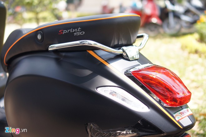Đuôi của Vespa Sprint 150 cũng được trang trí như GTS Super 150, với tên xe thêu trên yên và những chi tiết màu cam nổi bật.