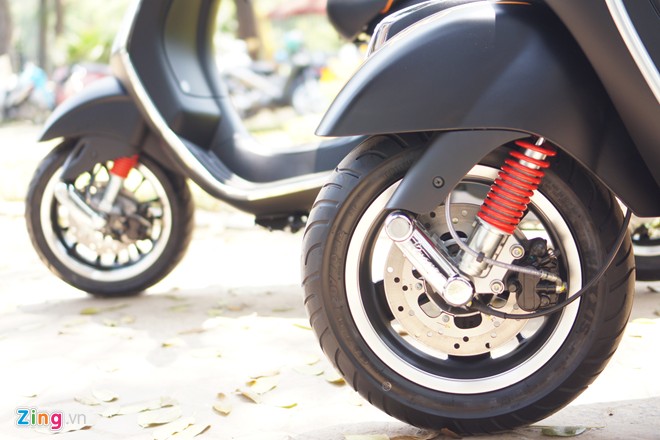 Giảm xóc trước của cả 2 mẫu Vespa đặc biệt đều có màu đỏ, kết hợp với màu đen mờ của thân xe làm tăng tính thể thao.