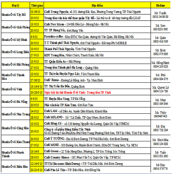 Lịch lái thử chi tiết tại các đại lý Honda trên toàn quốc.