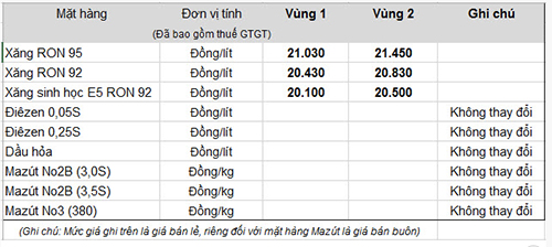 Cùng với xăng, 2 mặt hàng là diesel và dầu hoả cũng được phép điều chỉnh tăng 500 đồng một lít. Riêng dầu madút giảm giá nhẹ 64 đồng mỗi kg. Như vậy, sau khi điều chỉnh, mỗi lít xăng RON 92, xăng sinh học E5 được bán ra với giá tối đa 20.436 đồng, trong khi mức tương ứng đối với dầu hoả và diesel là 15.751 và 16.383 đồng.