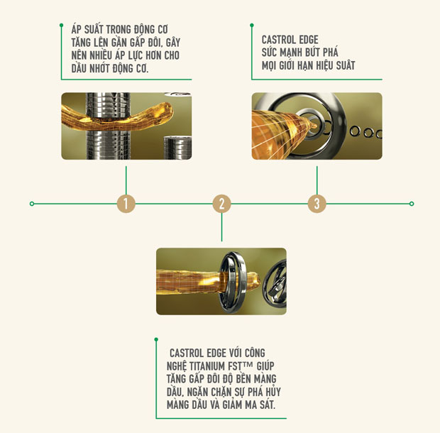 Khi nền công nghiệp xe hơi hiện đại ngày càng phát triển, công nghệ dầu nhớt phải đáp ứng được mọi thiết kế đột phá của các cỗ máy đẳng cấp. Chính sự liên tục đổi mới để bứt phá hiệu suất phi thường đã giúp hãng dầu nhớt Castrol ra mắt Castrol EDGE 5W-30 - cái tên được những nhà sản xuất xe hàng đầu thế giới lựa chọn. Công nghệ TITANIUM FSTTM trong Castrol EDGE 5W-30 đã thay đổi tính năng vận hành của dầu nhớt. Nó giúp tăng gấp đôi độ bền màng dầu, ngăn chặn sự phá hủy màng dầu và giảm ma sát để tối đa hóa hiệu suất động cơ. Với những lợi ích này, Castrol EDGE 5W-30 sẽ mang lại cảm giác tăng tốc đích thực trên mỗi chặng đường ở mỗi lần nhấn ga.