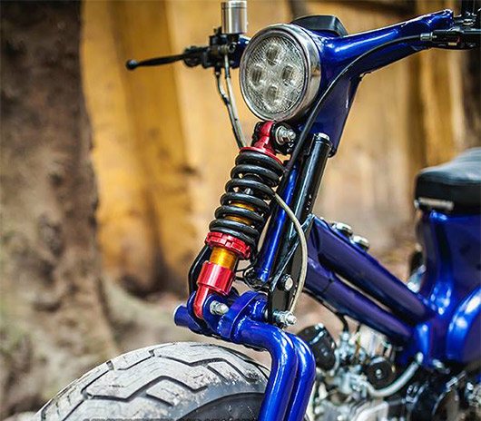Khung gầm của xe đã được thay đổi hoàn toàn so với xe nguyên bản. Để có thế lắp vừa cặp bánh khủng, chiếc Cub 50 sử dụng gắp đơn chế cực độc.
