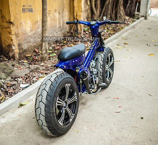 Đây được coi là bản độ độc và khủng nhất từ trước đến nay đối với những chiếc Honda Cub huyền thoại. Thay vì sử dụng những chiếc bánh nhỏ nhắn nguyên bản, chủ nhân của xe đã quyết định thay đổi hoàn toàn bộ khung để có thể lắp vào đó cặp bánh khủng đi kèm bộ mâm lấy nguyên từ xe hơi có kích thước lên đến 16 inch.
