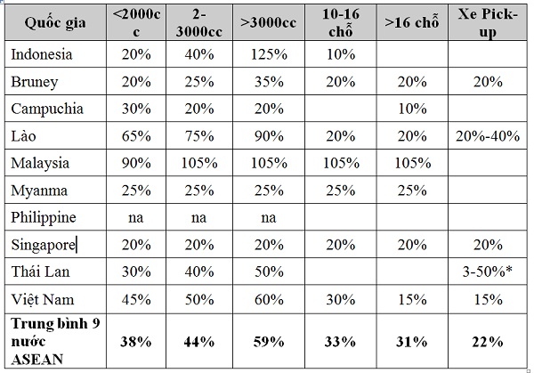 Như vậy, so với 10 nước ASEAN, mức thuế suất thuế TTĐB đối với xe ô tô từ 9 chỗ ngồi trở xuống có dung tích xi lanh dưới 2.000cc ở Việt Nam đang cao hơn 7% so với mức bình quân của khu vực (38%) và cao hơn 5% so với mức trung bình của 4 nước Indonesia, Malaysia, Singapore, Thái Lan. Trong đó, Thái Lan và Indonexia là 2 nước có nền công nghiệp ô tô tương đối phát triển và có xuất khẩu ô tô nhiều.
