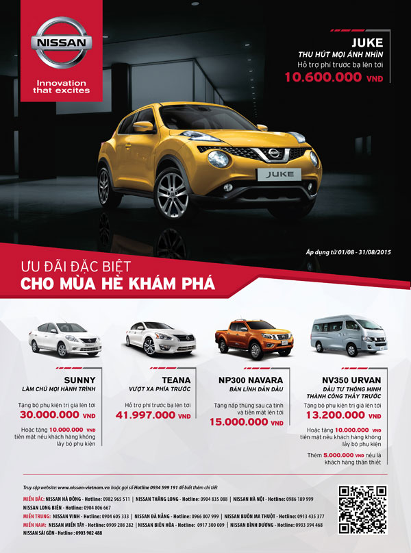 Từ nay đến hết 31/08/2015, khách hàng mua các sản phẩm của Nissan Việt Nam sẽ nhận được những ưu đãi đặc biệt.