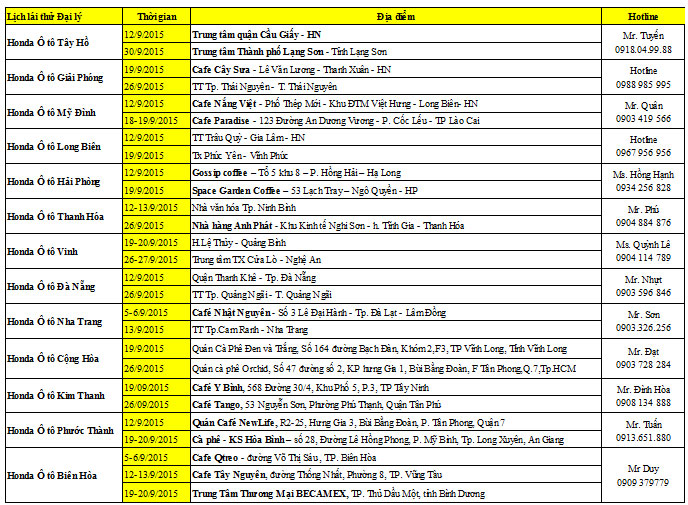 Lịch lái thử chi tiết tại các đại lý Honda Ôtô trên toàn quốc