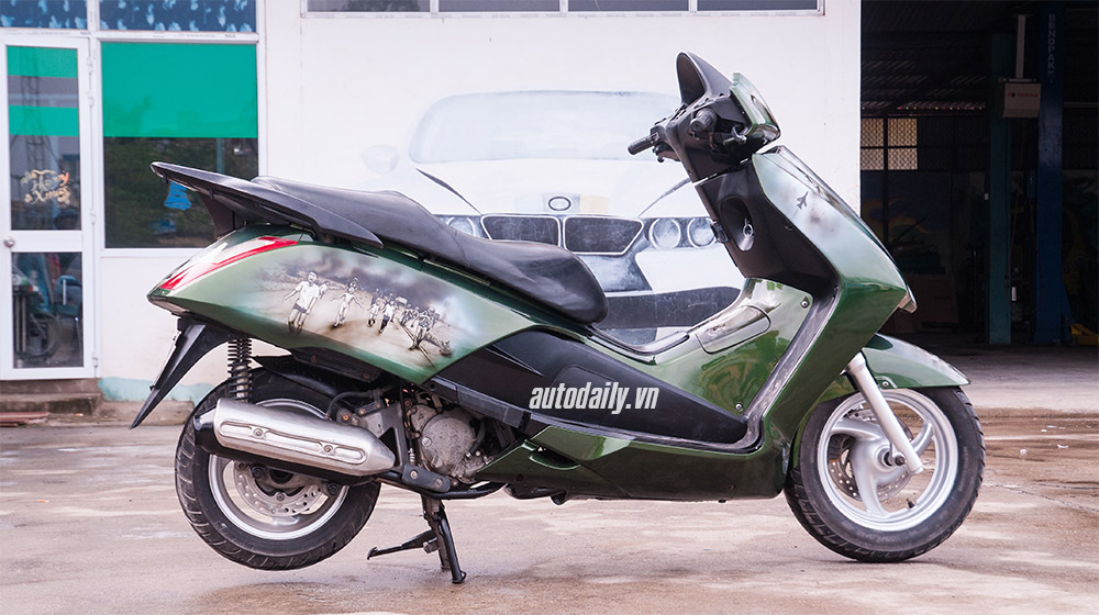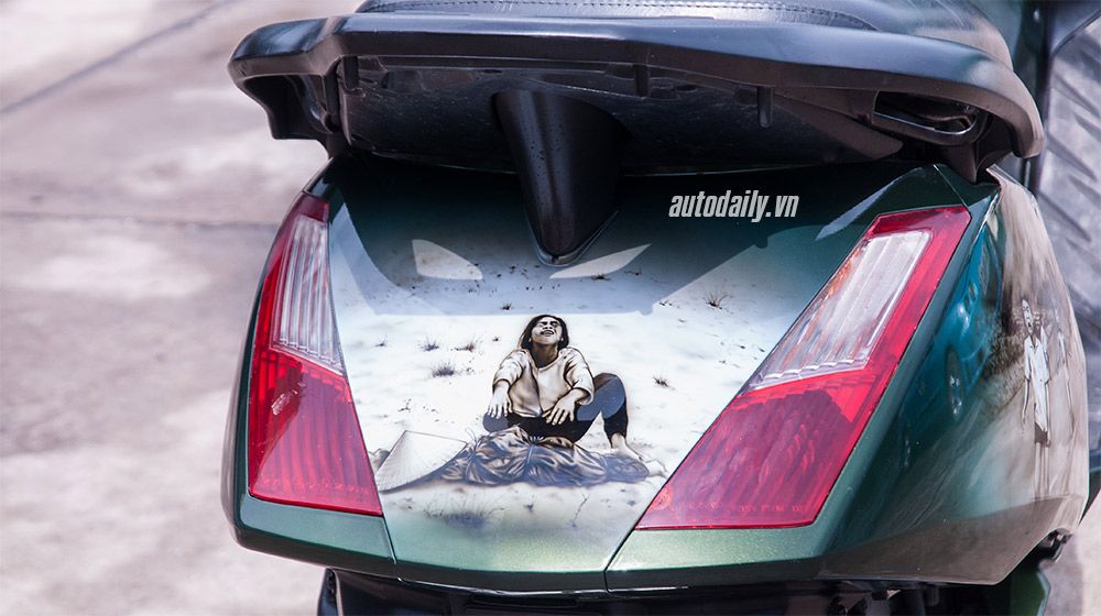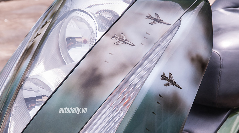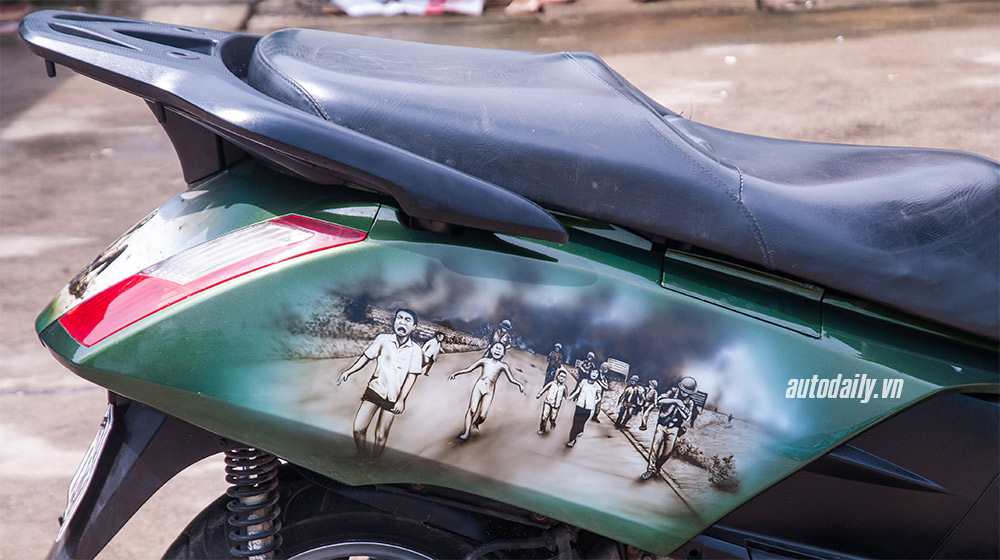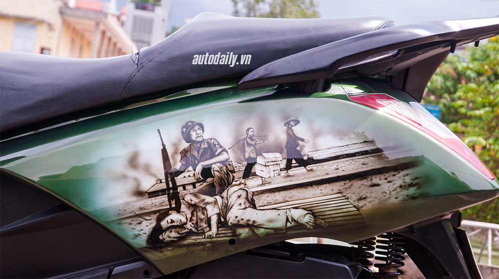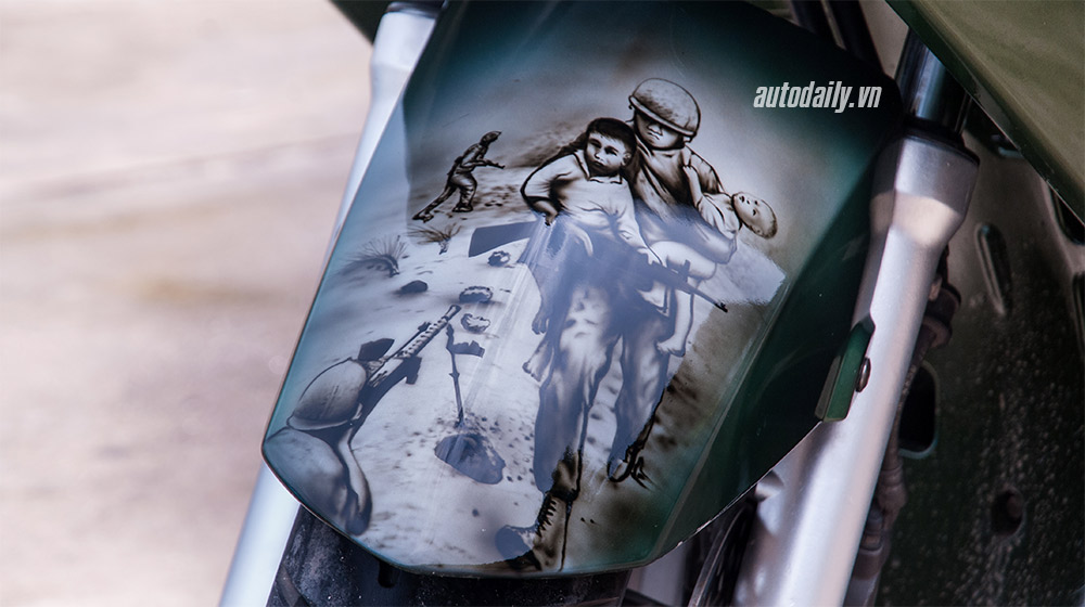 Chiếc Honda Pantheon 150 có tuổi đời khá lâu nay đã được nghệ nhân Airbrush làm lại với nước sơn xanh lá đậm, bộ áo mới còn tạo được nhiều điểm nhấn với những hình ảnh 3D sống động kể về sự tàn khốc của chiến tranh cũng như tính nhân văn và tình cảm con người trong lòng cuộc chiến đó.