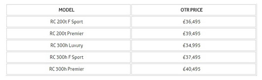 Cụ thể, tại thị trường Anh quốc, Lexus RC 300h Luxury sẽ có giá bán đề suất từ 34.995 bảng Anh (53.272 USD). Xe được trang bị bộ mâm hợp kim 18 inch, đèn pha full LED, cảm biến đỗ xe, hệ thống kiểm soát không khí 2 vùng độc lập, một màn hình giải trí đa phương tiện 7 inch được kiểm soát bởi bộ điều khiển từ xa, hệ thống điều khiển hành trình. Ghế ngồi trên xe được bọc da cao cấp, hàng ghế phía trước điều chỉnh bằng điện. Các chế độ lái bao gồm Eco, thông thường, thể thao.