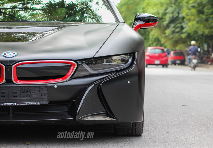 Không hài lòng với màu sơn đen – trắng nguyên bản của nhà sản xuất, chủ nhân của chiếc BMW i8 tại Hà Nội đã quyết định khoác lên xe của mình bộ áo mới làm từ chất liệu decan đen mờ cực kì ấn tượng. Ngoài ra, một số chi tiết trên xe như viền lưới tản nhiệt, ốp dưới gương chiếu hậu, một viền ngắn phía sườn và 2 đường viền khác phía đuôi có màu đỏ tươi khá nổi bật.