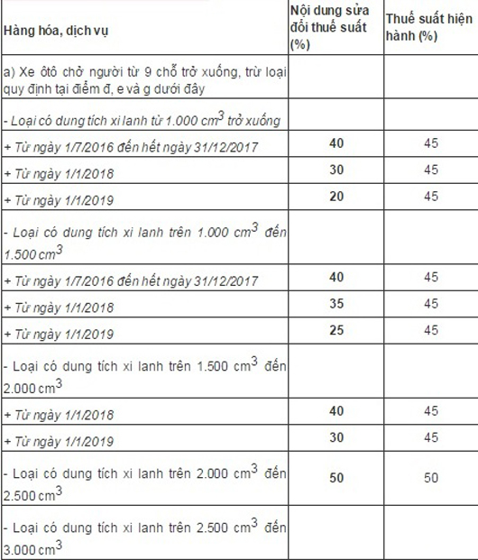 Với dòng xe có dung tích xi lanh từ 1.5L đến dưới 2.0L giữ nguyên mức 45% cho đến 2018 giảm về 40% và 2019 giảm về 30%.