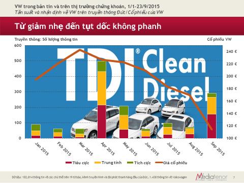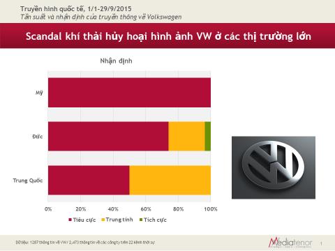 Tại thời điểm này, VW đang phải hứng chịu những đợt sóng đầu tiên. Theo số liệu thống kê và phân tích của Media Tenor, tại 3 thị trường lớn nhất của VW là Đức, Mỹ và Trung Quốc, hãng xe này đã bị truyền thông và giới phân tích chỉ trích và lên án kịch liệt. Đặc biệt là ở Mỹ, tất cả các thông tin và hình ảnh về VW trên truyền thông hoàn toàn tiêu cực.