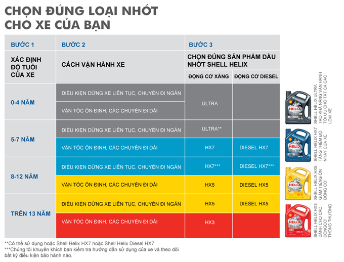 Ví dụ, cùng là xe 5 năm tuổi, nếu xe thường xuyên chạy trong đô thị, dừng xe liên tục, chuyến đi ngắn và tăng giảm tốc đột ngột, chủ xe nên chọn loại nhớt được thiết kế để tối ưu khả năng vận hành như Shell Helix Ultra. Nhưng nếu xe thường xuyên chạy đường trường với tốc độ ổn định, nhóm nhớt hướng đến sự hiệu quả và tiết kiệm nhiên liệu là ưu tiên hàng đầu, mà Shell Helix HX7 là sản phẩm điển hình.