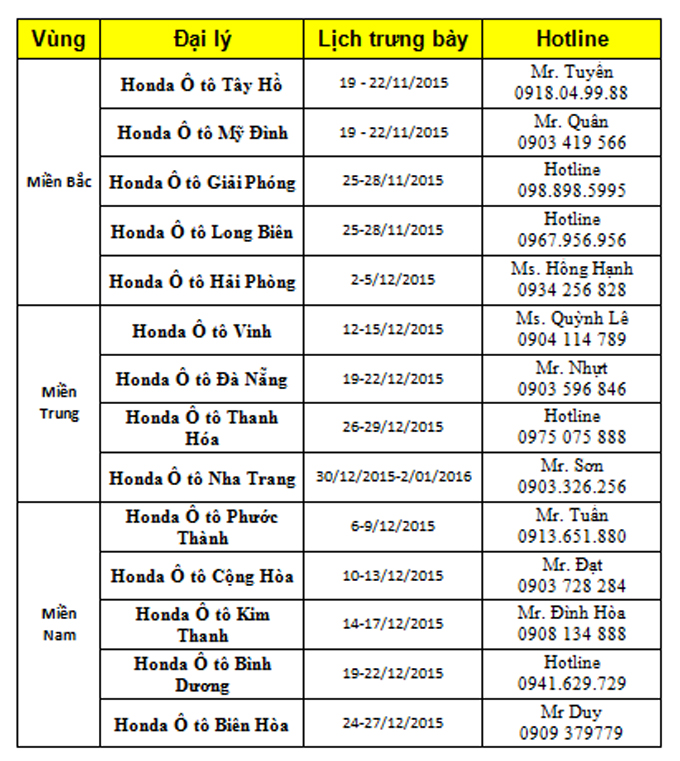 Với mong muốn giới thiệu rộng rãi hơn mẫu xe này đến người tiêu dùng, hiện tại, Honda Việt Nam đang triển khai chương trình trưng bày Odyssey tại các đại lý trên cả nước. Lịch trình trưng bày cụ thể như sau: