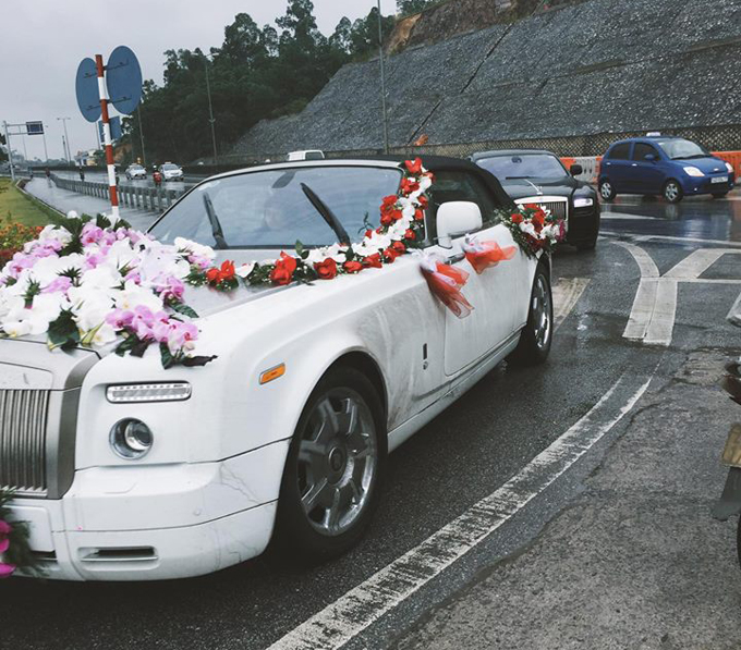 Cùng với chiếc Maybach 62S dùng để đưa đón gia đình nhà trai, đoàn xe hoa còn nổi bật với 1 chiếc Rolls-Royce Phantom Drophead làm xe hoa, 1 chiếc Rolls-Royce Phantom trắng của khách mời có biển số Hà Nội, 2 chiếc Rolls-Royce Ghost dùng để đưa đón gia đình nhà gái và đại diện 2 bên. Ngoài những chiếc siêu sang này, đoàn xe còn có sự xuất hiện của nhiều mẫu xe hạng sang có giá nhiều tỷ đồng khác như Range Rover Autobiography, Mercedes E400, Porsche Cayenne, Lexus LX570, ...