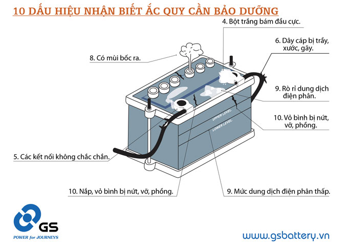 GS Việt Nam cũng khuyến cáo khách hàng nên thường xuyên kiểm tra ắc quy, đặc biệt là trước những chuyến đi dài và dần hình thành thói quen này để đảm bảo xe vận hành ổn định và an toàn cho gia đình. GS cũng hướng dẫn 10 dấu hiệu ắc quy cần thay thế mà khách hàng có thể nhận biết bằng mắt thường: