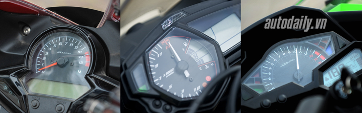 Thiết kế đồng hồ hiển thị trên 3 mẫu xe này là sự kết hợp giữa Analog và điện tử. CBR300R trông khá đơn điệu trong khi R3 và Ninja 300 trông hiện đại hơn.