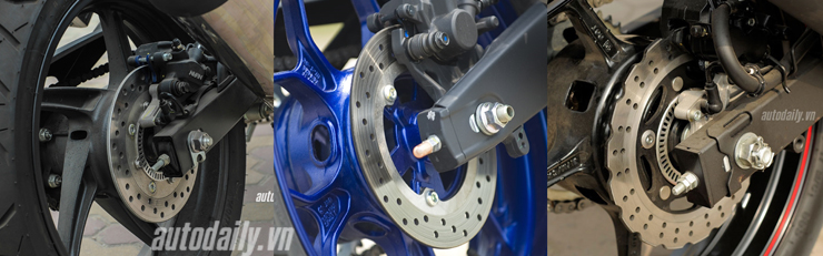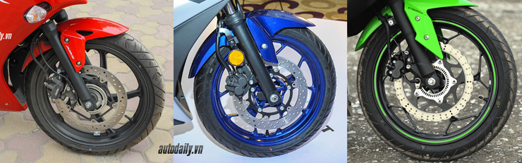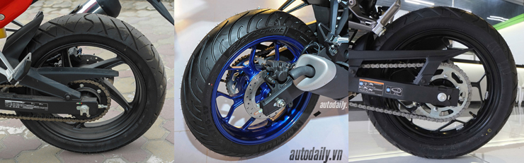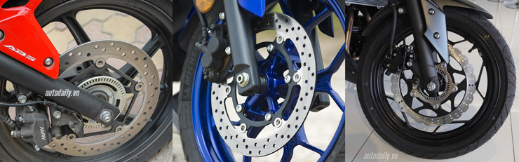 CBR300R sở hữu bộ mâm 17 inch 5 chấu thể thao, kết hợp cùng với lốp trước có kích thước 110/70 và 140/70 ở phía sau. trong khi đó Yamaha R3 là bộ vành nhôm 10 chấu được tối ưu hóa độ cứng và khả năng chịu lực, trang bị lốp 110/70-17 cho bánh trước và 140/70-70 cho bánh sau.