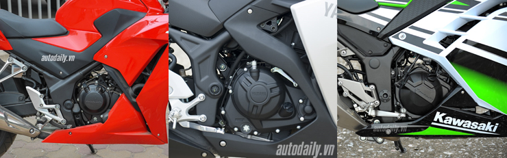 Với đường kính và hành trình piston 68mm x 44.1mm cùng tỉ số nén 11.2:1, khối động cơ sản sinh ra công suất cực đại 42 mã lực tại 10.750 vòng/phút và mômen xoắn cực đại 29,6 Nmtại 9.000 vòng/phút. Nằm ở giữa, Kawasaki Ninja 300 sử dụng động cơ 4 thì, 297 phân khối, làm mát bằng chất lỏng, công suất 39 mã lực tại 11.000 vòng/phút, mô-men xoắn cực đại 27Nm tại 10.000 vòng/phút, đi kèm hộp số 6 cấp độ.