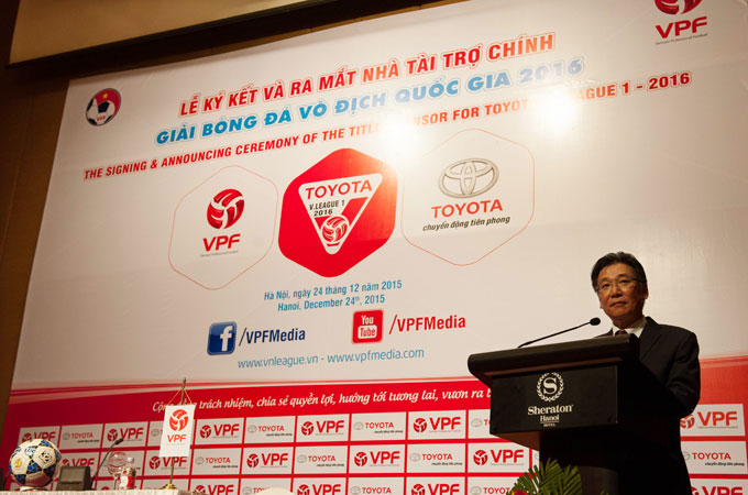 Đây là năm thứ hai liên tiếp Toyota Việt Nam với tư cách là nhà tài trợ chính sẽ đồng hành cùng với Công ty VPF tổ chức giải đấu có tên gọi chính thức là “Giải bóng đá Vô địch Quốc gia Toyota 2016” (Toyota V.League - 2016). Ở mùa giải 2015, cùng với Nhà tài trợ Toyota, người hâm mộ cả nước đã được thưởng thức tổng cộng 182 trận đấu đầy sôi nổi, hấp dẫn. Cùng với Giải đấu, thương hiệu Toyota đã truyền cảm hứng và đem đến không khí của những ngày hội bóng đá đến 1.341.500 khán giả trực tiếp đến sân và hàng triệu khán giả xem truyền hình cả nước.
