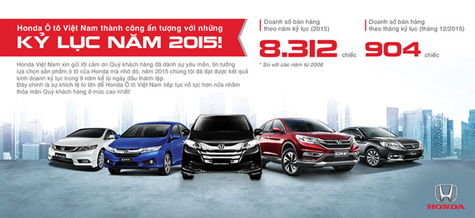 Với 904 xe bán ra trong tháng 12/2015 và 8.312 xe được bán ra trong cả năm 2015 (tăng trưởng 28% so với 2014), Honda Ôtô Việt Nam đã khép lại một năm kinh doanh thành công rực rỡ. Đây cũng là năm thứ 3 liên tiếp Honda Ôtô Việt Nam tạo nên cột mốc kỷ lục về doanh số bán theo năm.