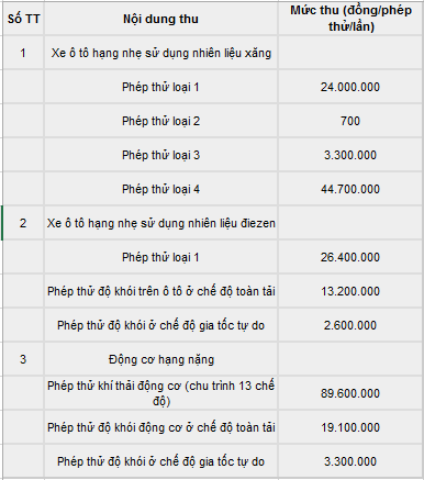 Cụ thể, phí thử nghiệm khí thải tiêu chuẩn Euro 2 đối với ô tô được quy định như sau: