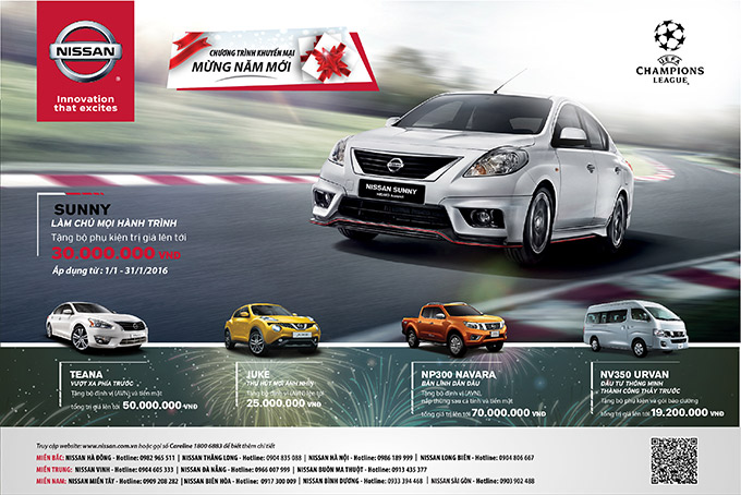 Nissan Việt Nam giới thiệu chương trình khuyến mãi đặc biệt cho tất cả các dòng xe tại tất cả các đại lý Nissan trên toàn quốc từ ngày 01/01/2016 đến hết ngày 31/01/2016.