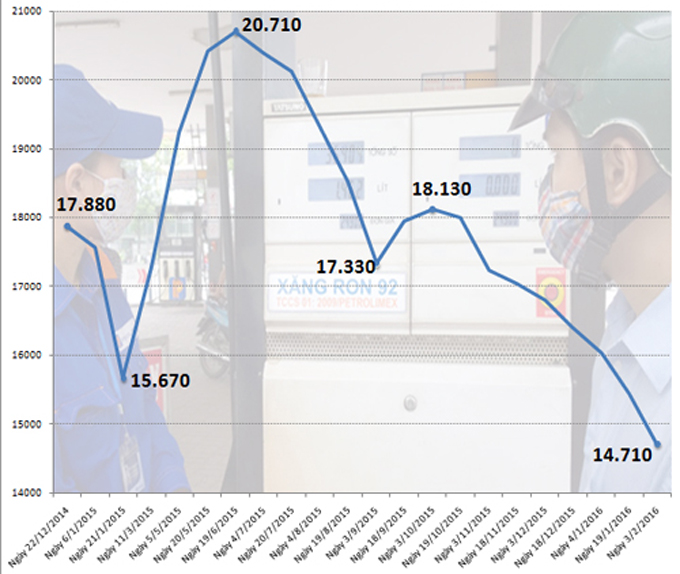 Đây là lần giảm thứ 3 liên tiếp của giá xăng dầu từ đầu năm 2016. Còn nếu tính từ đỉnh cao hồi giữa tháng 6/2015, giá xăng đã trải qua 15 lần điều chỉnh với mức giảm tổng cộng 6.000 đồng một lít. Đây cũng là mức giá thấp nhất kể từ tháng 8/2009, khi giá bán lẻ mỗi lít xăng là 14.700 đồng.