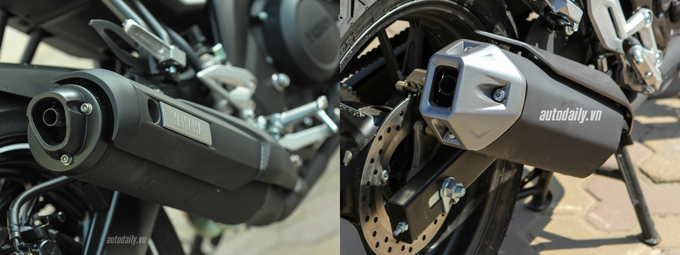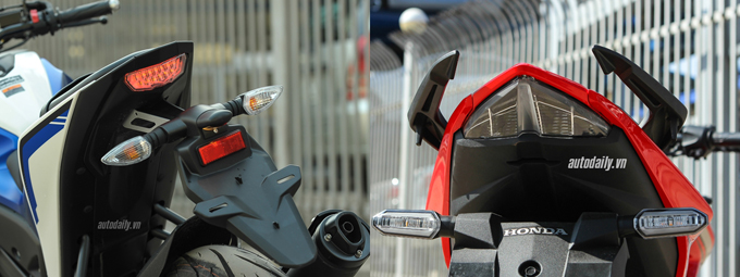 Tiến về phía sau, đèn hậu trên cả 2 xe đều được sử dụng công nghệ LED tuy nhiên cụm đèn hậu của MT-15 được thiết kế khá nhỏ còn CB150R là kiểu thiết kế hình tam giác ăn khớp với hình dáng của phần tay nắm dắt phía trên. Cụm xi-nhan báo rẽ trên cả 2 xe đều được đặt trên pát gắn biển số.