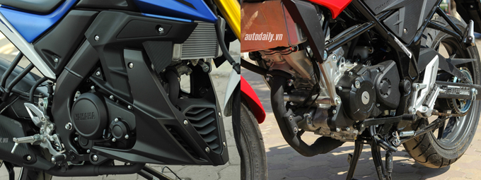 Yếm chắn gió phía trước trên Yamaha MT-15 được làm liền khối với bình xăng trong khi đó trên CB150R là kiểu lắp tách rời. Dung tích bình xăng trên MT-15 là 10,2L còn Honda CB150R 2016 là 12L.