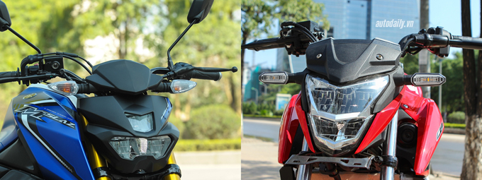 Về thiết kế, mặt trước của Yamaha MT-15 nổi bật với đèn pha được làm khá ngầu sử dụng công nghệ chiếu sáng LED, 2 đèn xi-nhan tách sang 2 bên trên phần mặt nạ. Ở phía đối thủ, đèn pha của Honda CB150R 2016 cũng sử dụng công nghệ LED có thiết kế 2 tầng khá ấn tượng, cặp đèn xi-nhan tách sang 2 bên tương tự như MT-15.