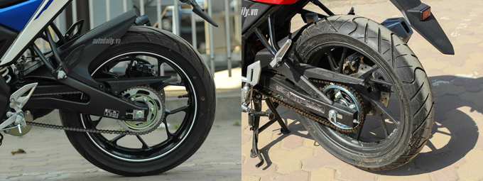 Ở phía sau, MT-15 sử dụng loại mâm 5 chấu kép 17 inch tương tự phía trước nhưng đi kèm lốp 130/70 còn Honda CB150R là loại 17 inch 5 chấu kép lốp 130/70.