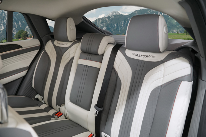 Phần đuôi cũng nhận được nhiều sự thay đổi như có thêm một cánh gió nhỏ cố định làm từ carbon, 2 mang cá 2 bên, cản sau và chụp ống xả thay đổi hoàn toàn với chất liệu carbon siêu nhẹ. Như thường lệ, logo ngôi sao 3 cánh phía trước và sau xe được thay thế bằng biểu tượng của hãng độ Mansory. Trong khi đó, không gian nội thất của xe là sự kết hợp giữa chất liệu da cao cấp màu trắng – bạc và carbon siêu nhẹ.